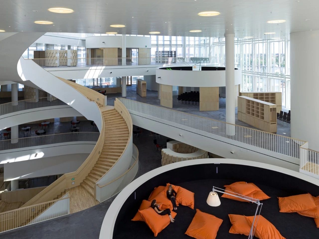 Ørestad体育馆(高中)位于丹麦首都哥本哈根,建成于2007年,由3XN建筑工作室设计,以其创新的建筑而闻名,完全打破了传统教室的模式,取而代之的是每一层都是独立的学习空间。该建筑获得2009年论坛援助奖,并被提名为米斯范德罗赫奖。评委会特别称赞道:“中央大堂和楼梯圆形整个机构连接在一起,并给出了凝聚和融合的强烈的印象”。