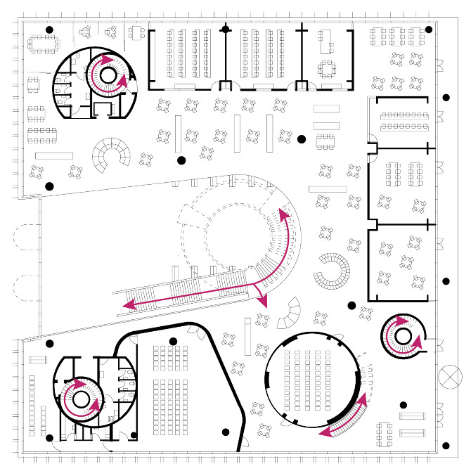 四个回旋镖形楼层甲板被旋转以形成上部结构,形成建筑的柔性整体框架。避免层次变化以使得结构的灵活性尽可能地更高,并使不同的教学和学习空间相互重叠,打破壁垒,互动变得无边界。