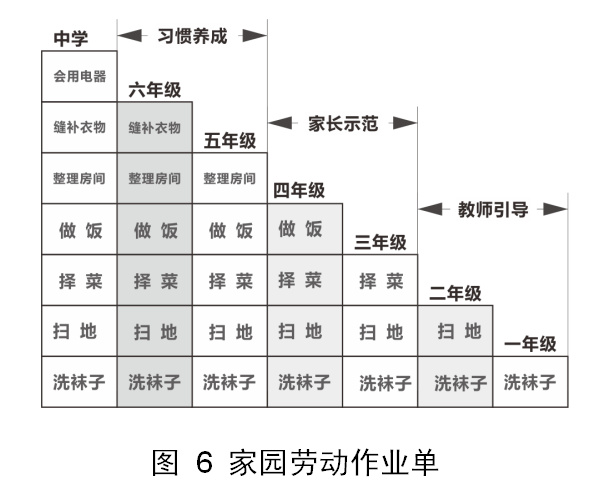 其中低年级学生年龄小,居家时间长,对学生劳动教育的比例上侧重为校园劳动和家园劳动,内容以劳动认知为主;中年级学生校外参与时间增多,课时上田园劳动和社园劳动的比例按照中段学生年龄特点加大;高年级段学生居家时间减少,学科综合能力加强,课时比例侧重在社园劳动和校园劳动上。
