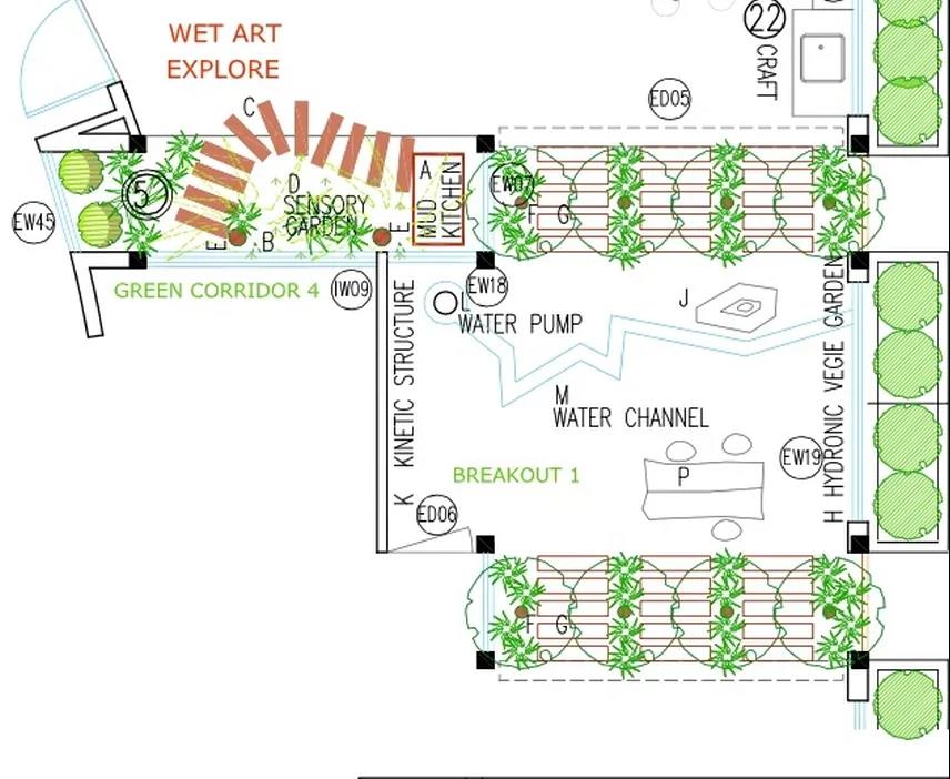一个显著的特色是增加了位于游戏室之间的景观“绿色走廊”,为每个游戏室提供绿色环绕效果。这些是室内游乐区的可进入部分,但对天空和室外环境开放。每一个走廊都有自己的小型生态系统,包括高大的树木、植物、岩石和通过可定制的动态水墙雕塑和地漏引入,为儿童的健康增加了一个持久的亲生物、有趣且和谐的环境。