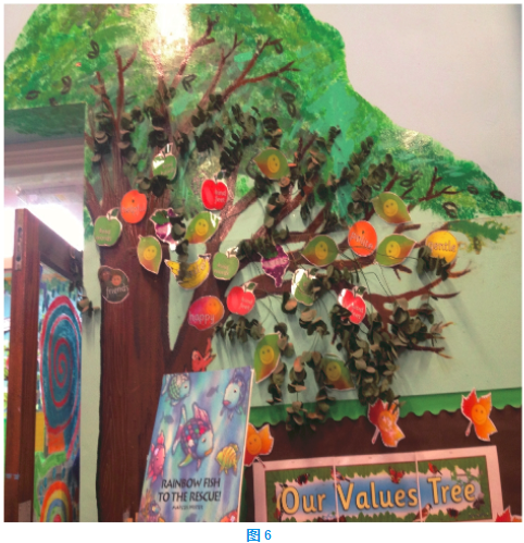 图23反映的是一个教会学校对于学生发展观的建构,包括快乐、尊重、真理、友善、爱、耐心、信赖、慷慨、宽恕。可以看出来,学校通过大块展板,并附上学生照片等内容,形象化地体现了基于学生发展的学校文化。